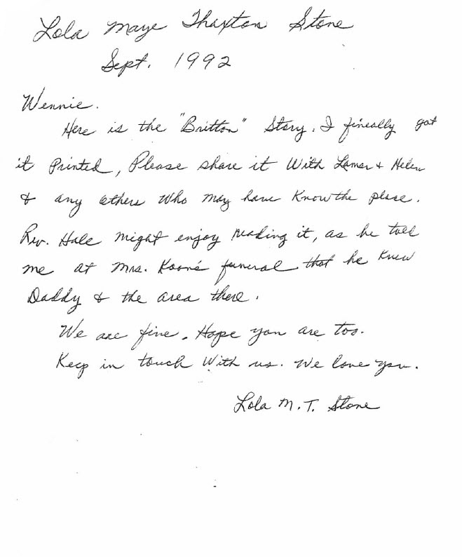 Here is the "Britton" Story. I finally got it Printed, Please share it with Lamar & Helen & any others who may have Know the place. Rev. Hale might enjoy reading it, as he told me at Mrs. Koone' funeral that he knew Daddy & the area there.