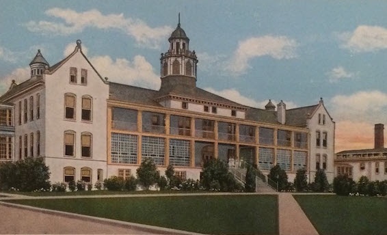 The hospital was located upon a knoll in the College Hills area and was said to be the prettiest area in Texarkana. The large three story structure was of brick and wood. It had a wooden roof with a dome tower rising above the trees. The front veranda with its large white columns gave a Southern welcome to all who came up the wide driveway which circled the building. An unpaved road led down the hill to the railroad tracks and a small brick depot where the patients could disembark for the hospital or depart for their return trip home. If a patient was too ill to walk up the hill to the hospital, the ambulance drawn by a horse would be at the station to transport them to the facility. In later years there were other modes of transportation.